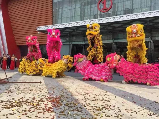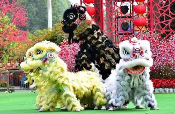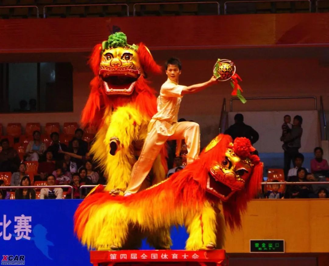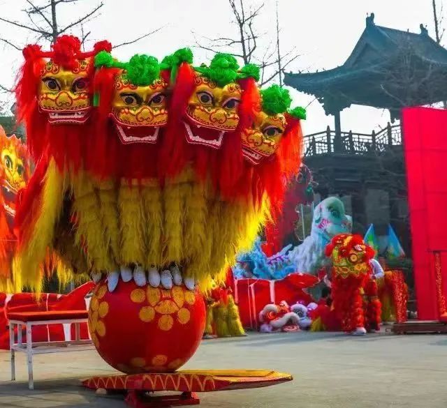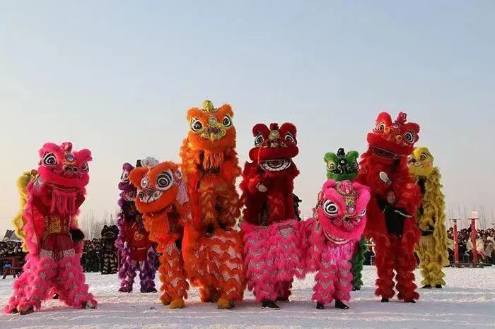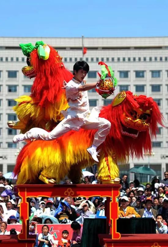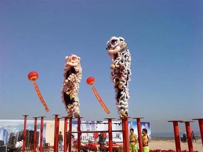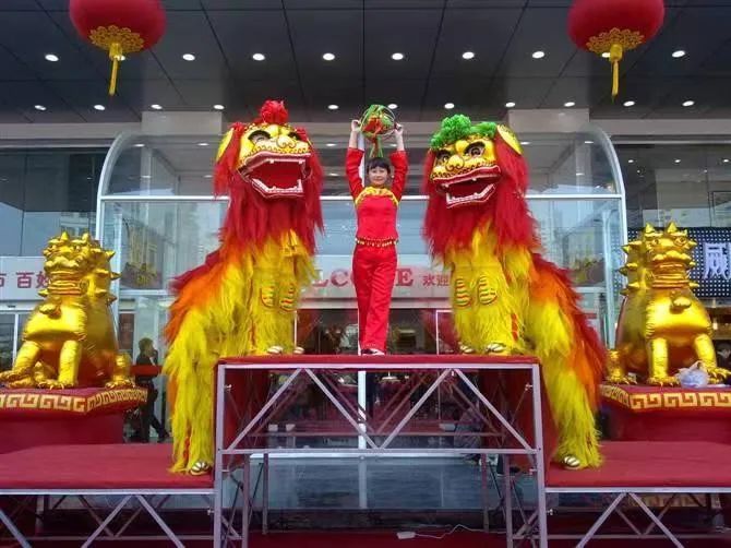 舞狮有南北之分,分为南狮和北狮,北狮是在长城以北流行的,北狮造型逼真,头部造型比较简单,雄狮头戴着红色领结,雌狮头戴绿色领结,全身披着金色的毛。