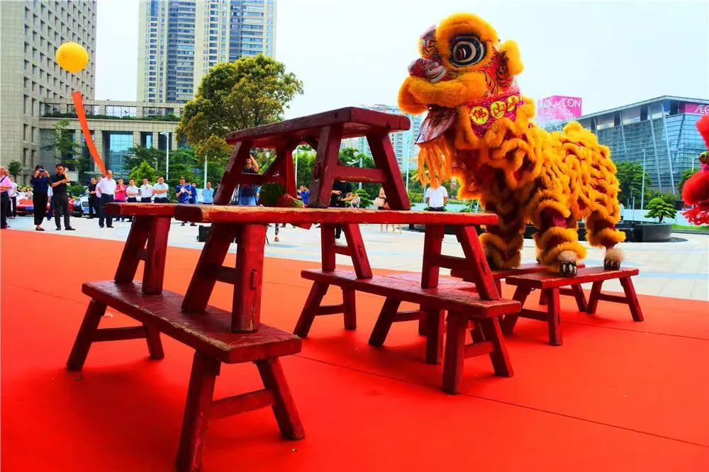 南狮它有一个基本特征是外形夸张,它通过模仿狮子的看、站、走、跑、跳、滚、睡、抖毛、挠痒等动作搭配着狮子外套看起来威武中透着一丝傻气,也就是我们常说的憨态可掬,它不仅仅只有一些简单的动作,还能展示”耍长凳”、”梅花桩”、”跳桩”、”隔桩跳”、”亮搬造型”、”360度拧弯”、”独立单桩跳”、”前空翻二级下桩”、”后空翻下桩”等高难度技巧,生动形象。
