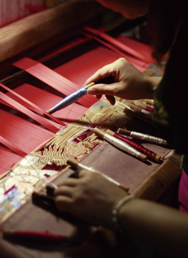 有了“花本”作为桥梁,织造者无需多加思量便可上机织造,两位织工密切配合,楼上“拽花工”负责提升经线将“花本”中的信息一一传出,楼下的织手根据提起的经线,用飞梭将五颜六色的线交替盘织,妆金敷彩。