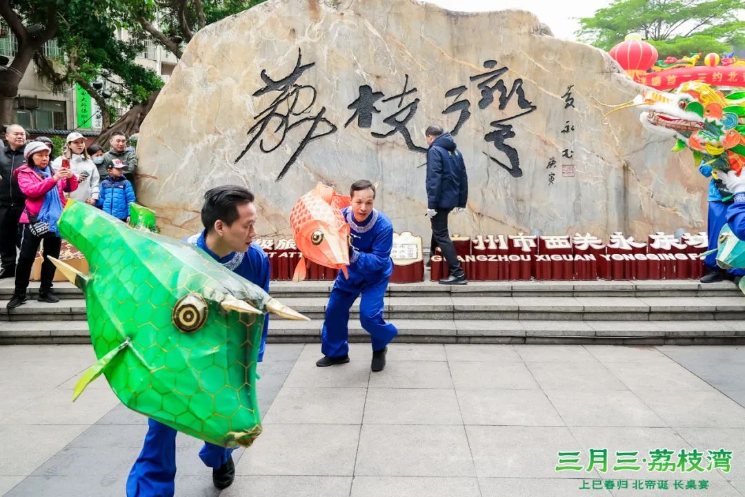 来自深圳沙头角的鱼灯舞民俗起源于明末清初,已有300多年历史。最初是渔民庆祝丰收、祈求平安的民俗活动,后逐渐发展为逢年过节表演的传统舞蹈。反映了沿海客家人“鱼灯会友”的习俗,兼具祭祀和娱乐功能。鱼跃羊城,他们在荔湾湖这里游得格外畅快!