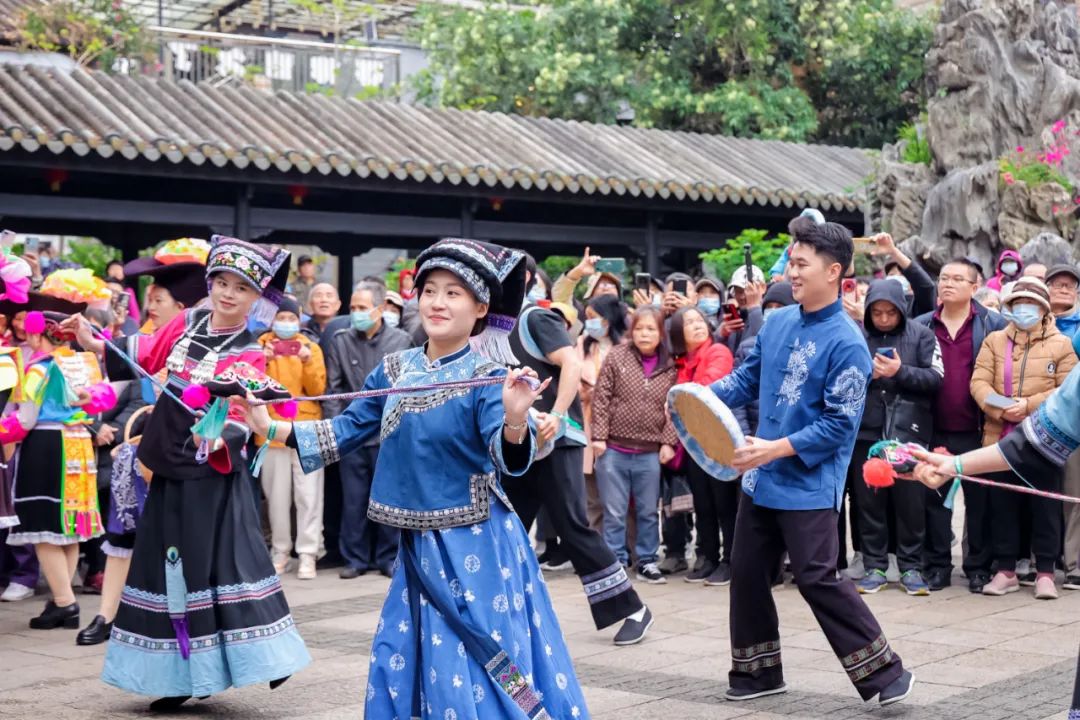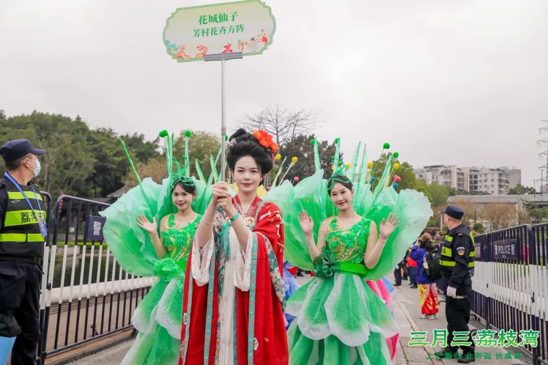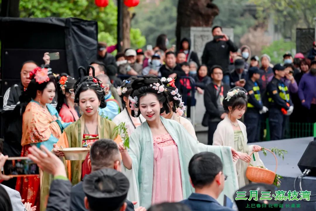 午后,荔湾湖畔碧波映翠,40余位汉服佳人沿九曲桥款款而行,她们沿湖踏青,向游人赠送鲜花,重现“曲水流觞”的诗意场景;游客们纷纷参与其中,沿着湖畔漫步,接受佳人们赠送的“春日福礼”,感受一份来自远古的纯净与神圣,为这荔湖春日的踏青增添不少雅趣。