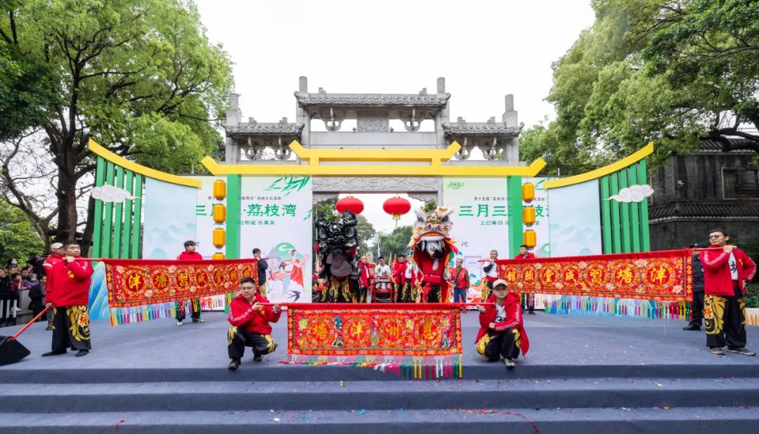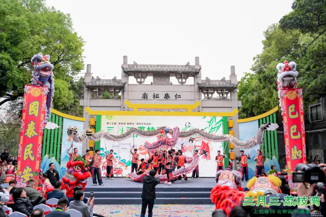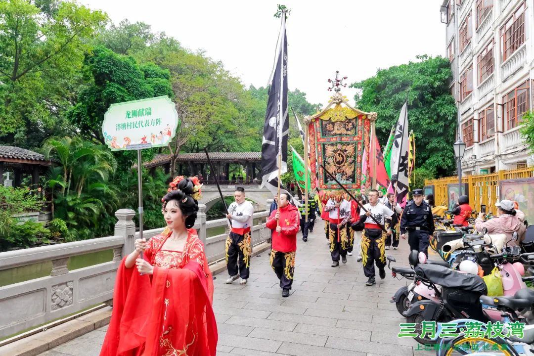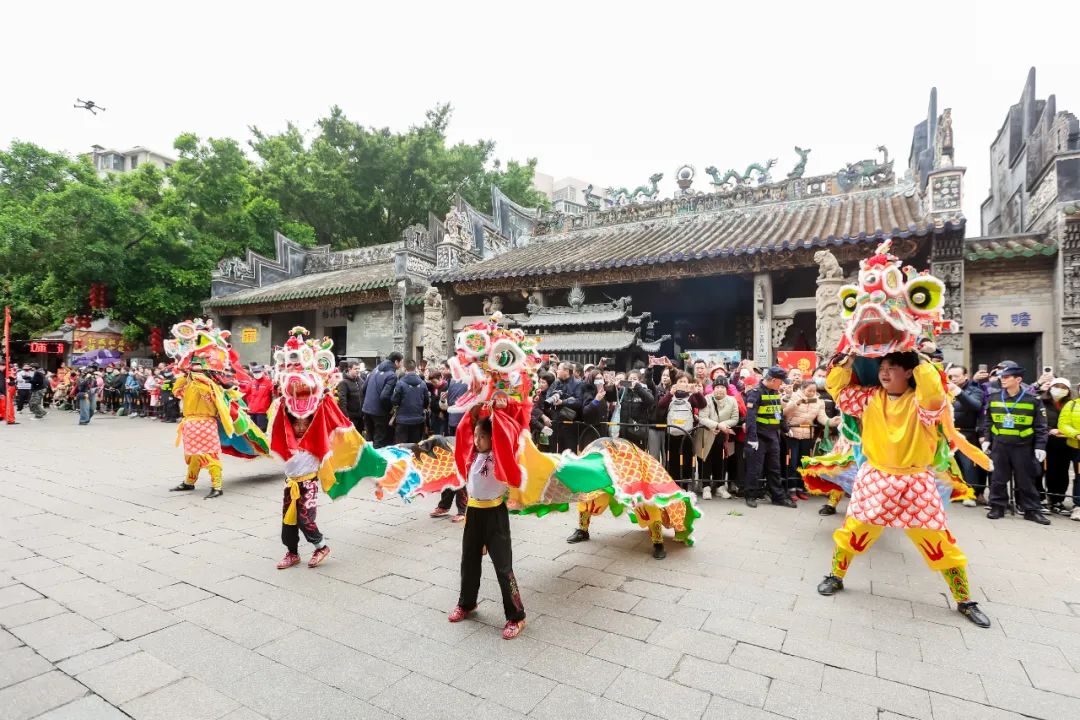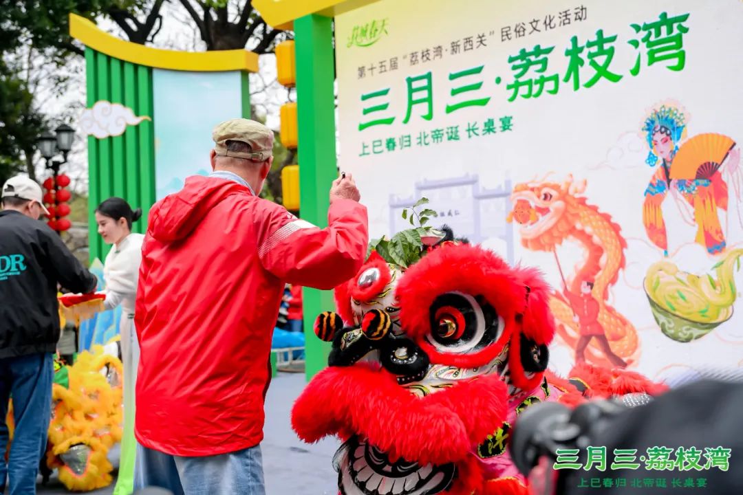 3月31日早上10点,仁威庙牌坊广场上,三月三活动启动仪式盛大开启。龙狮献瑞闹西关,泮塘村龙狮队的精彩采高青表演为现场观众带来了极具西关民俗风情的开场表演。随后,来自中山的醉龙舞、潮汕的英歌舞,以及荔湾本土的精武西关,轮番登场献艺,以一段民俗串烧表演展现岭南文化的多元与活力。“三月三,临水祓禊”,启动仪式上,依古礼行“祓禊礼”,10多位汉服佳人从文塔祈福归来,为现场嘉宾以兰草净水洗去尘埃,呈现古时祓禊场景。仪式最后,泮塘村长老们上台进行醒狮点睛及切烧猪,祈愿风调雨顺、福泽绵长。